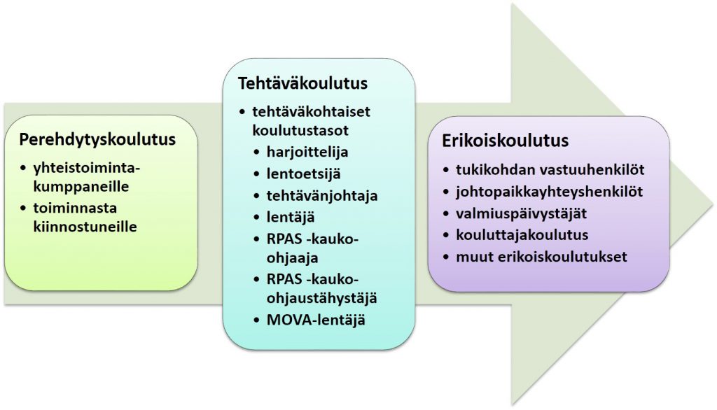 Tehtäväkohtainen koulutus koostuu harjoittelijan, lentoetsijän, tehtävänjohtajan ja lentäjän koulutuksesta, tässä järjestyksessä. Järjestyksestä ei voi poiketa, koska uuteen kelpoisuuteen johtava koulutus edellyttää aiempaa koulutusta.